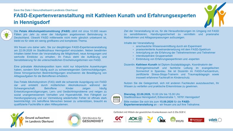Wir freuen uns daher sehr, Sie zur diesjährigen FASD-Expertenveranstaltung am 22.09.2026 im Stadtklubhaus Hennigsdorf einzuladen. Neben bewährten Inhalten bietet Ihnen die Veranstaltung die Möglichkeit, neue Anregungen und wertvolle Einblicke zu erhalten. Im Fokus steht die Aufklärung und Sensibilisierung für die unterschiedlichen Erscheinungsformen von FASD.