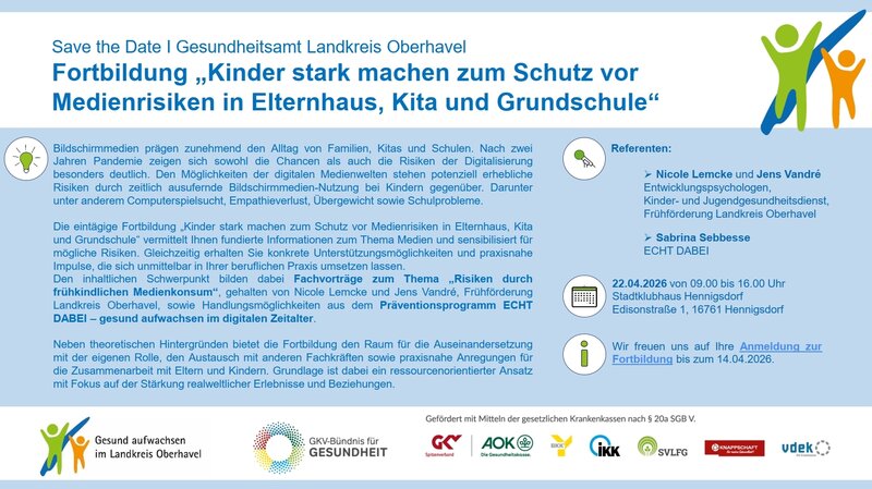 Den inhaltlichen Schwerpunkt bilden dabei Fachvorträge zum Thema „Risiken durch frühkindlichen Medienkonsum“, gehalten von Nicole Lemcke und Jens Vandré, Frühförderung Landkreis Oberhavel, sowie Handlungsmöglichkeiten aus dem Präventionsprogramm ECHT DABEI – gesund aufwachsen im digitalen Zeitalter.