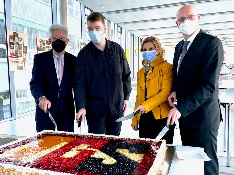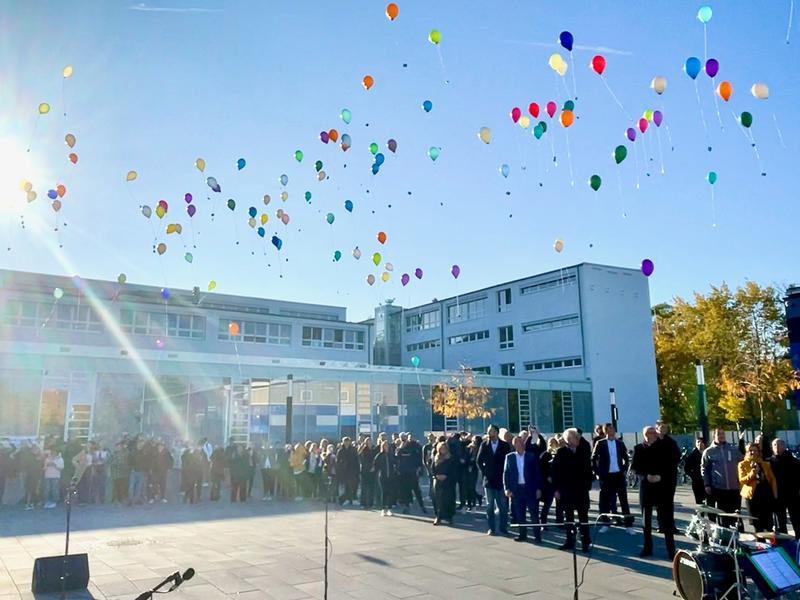 Aus diesem Anlass schnitten Landrat Ludger Weskamp und Schulleiterin Manuela Brüssow am Freitagvormittag, 29.10.2021, eine große Geburtstagstorte an, von der später die mehr als 800 Schülerinnen und Schüler probieren konnten. Zuvor ließen Vertreter aller 34 Klassen bunte, umweltfreundliche Luftballons in den Himmel steigen, an denen Wünsche für die Schule befestigt waren. Mit Musik und Grußworten, einer Fotoausstellung und einer digitalen Präsentation zum Baufortschritt zelebrierte die Schule die nachträgliche Einweihung.