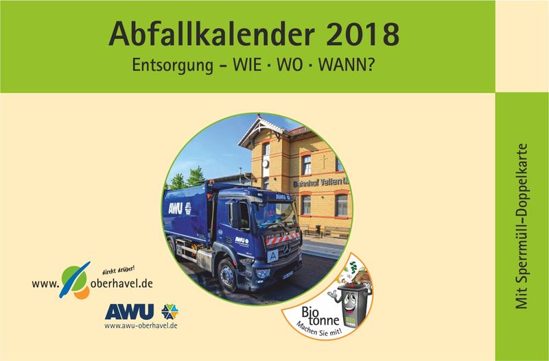 Ab Mitte Dezember wird der Abfallkalender für 2018 in den Vertriebsstellen für die Gelben Säcke, in Rathäusern, Bürgerämtern und Gemeindeverwaltungen sowie in Bibliotheken und anderen öffentlichen Einrichtungen erhältlich sein. Die AWU Oberhavel GmbH beginnt am Montag, dem 11.12.2017, mit der Verteilung der Broschüre an die genannten Stellen. Dies wird einige Tage in Anspruch nehmen. Die digitale Version der Broschüre ist bereits unter www.oberhavel.de/abfall sowie unter www.awu-oberhavel.de abrufbar.
