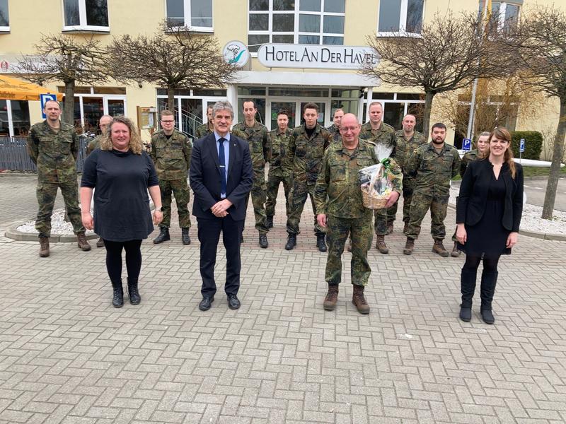 Auch die Bundeswehr war mehrfach – teils monatelang – in Oberhavel unterstützend im Einsatz. Zuletzt waren 24 Soldatinnen und Soldaten für die Unterstützung bei der Kontaktnachverfolgung und beim Impfen im Einsatz. Egmont Hamelow verabschiedete sie am Donnerstag, dem 17.03.2022, gemeinsam mit Gesundheitsdezernentin Kerstin Niendorf in Oranienburg und danke ihnen für ihren engagierten und zuverlässigen Einsatz in Oberhavel. Angesichts des Krieges in der Ukraine wurde die Hilfeleistung nicht verlängert. „Ich wünsche Ihnen für die nun anstehenden Aufgaben alles Gute! Bleiben Sie gesund und wohlbehalten!“, so Hamelow.