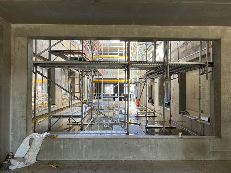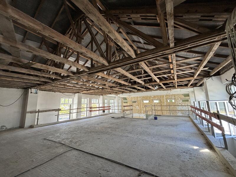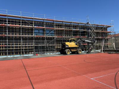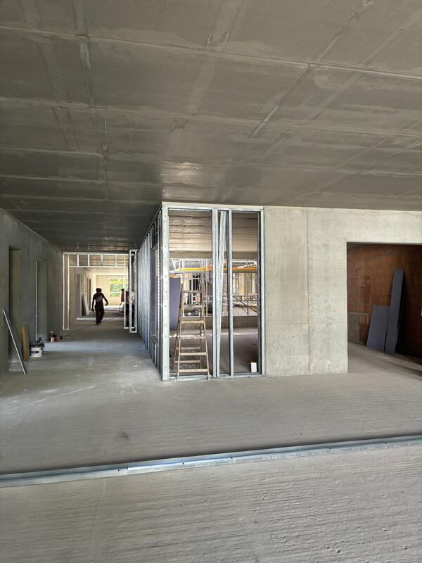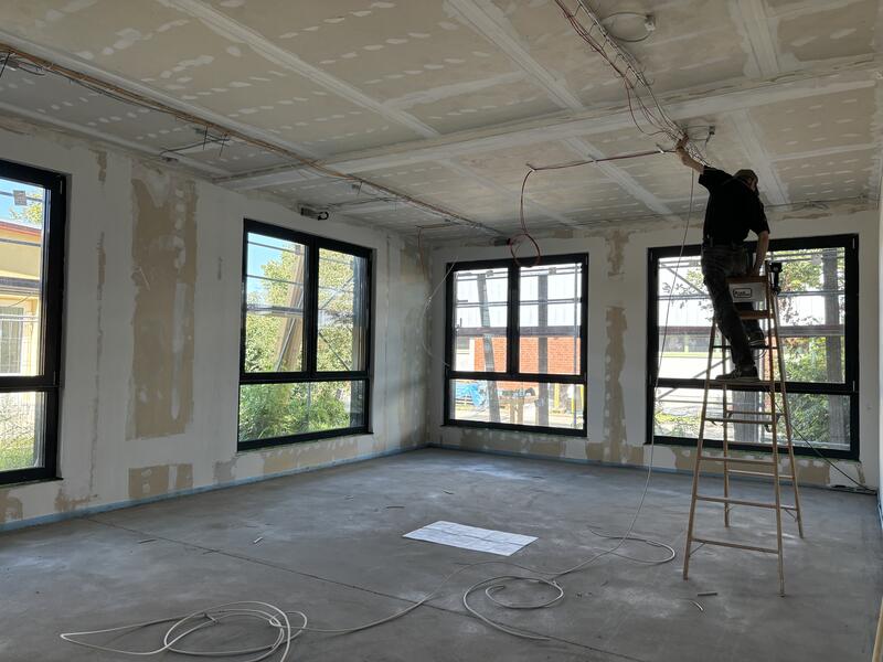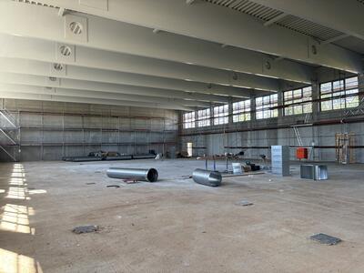 Ein architektonisch ganz besonders interessantes Projekt realisiert der Kreis am Alexander-S.-Puschkin-Gymnasium in Hennigsdorf. Die kleine Sporthalle (Heine-Halle) wird zu einer Mensa auf zwei Ebenen umgebaut und bietet in Zukunft 180 Sitzplätze, eine Küche sowie attraktive Außenflächen. So wurde jüngst eine Zwischendecke eingezogen. Es folgen nun die Fenster und der Innenausbau. Die Baukosten von etwa 2,5 Millionen Euro werden mit maximal 1,6 Millionen aus dem Förderprogramm KIP II unterstützt. Die Arbeiten beinträchtigen den Unterricht nicht. Die Mensa soll Ende 2024 fertig sein.