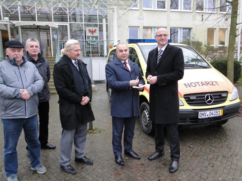 Bereits zum zehnten Mal wurde ein außer Dienst gestellter Rettungswagen aus dem Landkreis Oberhavel für den symbolischen Betrag von einem Euro an den Partnerlandkreis Siedlce übergeben. Dazu überreichte Landrat Ludger Weskamp heute seinem polnischen Amtskollegen Dr. Dariusz Stopa die Schlüssel für das reisefertige Fahrzeug vor dem Haupteingang der Kreisverwaltung. Das Notarzteinsatzfahrzeug (NEF), ein Mercedes-Benz, Vito 115 CDI, Baujahr 2008, befindet sich in einem guten technischen Zustand und soll künftig 700 Kilometer östlich in Siedlce seinen Dienst versehen. In Oberhavel musste das Fahrzeug auf Grund der strikten Vorschriften in der Notfallrettung planmäßig ersetzt und ausgesondert werden. Landrat Ludger Weskamp betonte bei der Übergabe, dass das Geschenk die gewachsene Freundschaft zwischen den Feuerwehren Oberhavels und ihren Partnerverbänden bezeugt. „Der gute Zustand des Fahrzeugs lässt eine Nutzung in Siedlce noch über Jahre in der Gefahrenabwehr zu und wird helfen, die technische Ausstattung dort weiter zu verbessern“, so Weskamp.