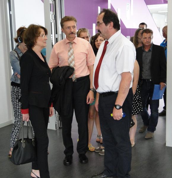 Im Anschluss besuchten Dagmar Reim und Landrat Schröter die Käthe-Kollwitz-Gesamtschule in Mühlenbeck. Schulleiterin Kathrin Haase führte durch die neu strukturierte Lernlandschaft. Die Farb- und Raumgestaltung des neuen Schulgebäudes schafft ideale Lernbedingungen für Schüler aller Klassenstufen.
