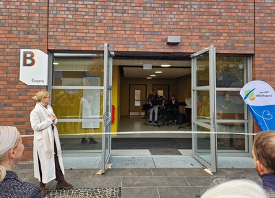 Eine weitere Station, die Landrat Alexander Tönnies und Holger Mittelstädt präsentierten, war die neue Drei-Feld-Sporthalle der Torhorst-Gesamtschule in Oranienburg. Noch bis zum vergangenen Schuljahr teilten sich die Schülerinnen und Schüler die Sporthalle mit der Havelschule und nutzen stundenweise auch die Turm ErlebnisCity sowie den Schlosspark. Für den Sportunterricht stehen nun auf rund 1.200 Quadratmetern eine Halle und ein angegliederter Flachbau mit Sanitär- und Umkleideräumen, Geräte-, Technik- und drei Mehrzweckräumen zur Verfügung. Außenanlagen und Parkplatz werden bis Ende des Jahres fertiggestellt. Insgesamt knapp 12 Millionen Euro hat das Projekt gekostet. Unweit der neuen Halle ist außerdem in den Sommerferien ein Modulbau mit weiteren Unterrichtsräumen für die rund 900 Schülerinnen und Schüler der Torhorst-Gesamtschule gesetzt worden.