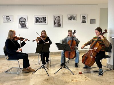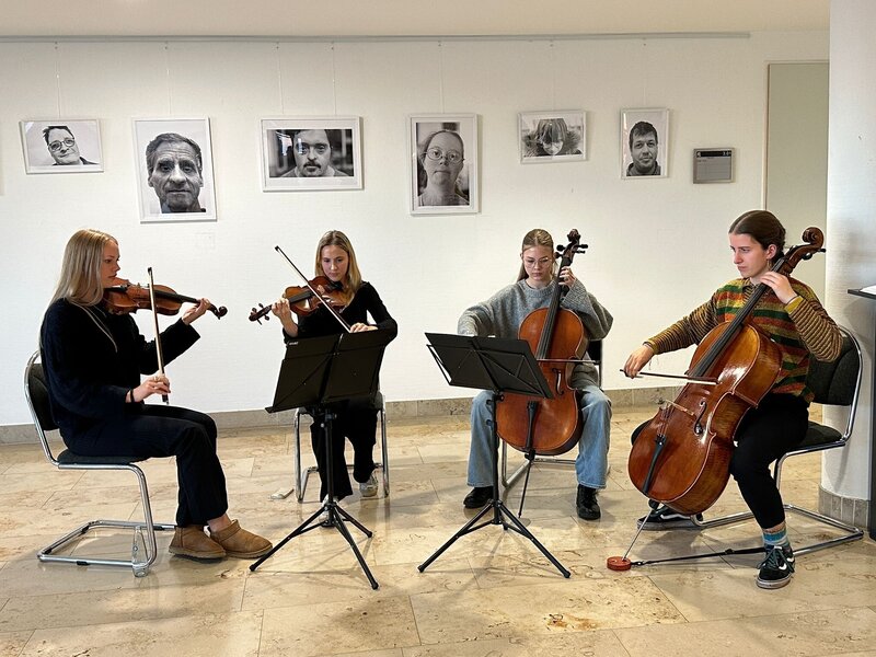 Die Lebenshilfe für Menschen mit geistiger Behinderung e. V. Oberhavel Süd zeigt in der Kreisverwaltung Oberhavel ihre Ausstellung „Vielfalt im Fokus“. Landrat Alexander Tönnies und Uta Gerber, Geschäftsführerin der Lebenshilfe, eröffneten die Schau am Donnerstag, 06.11.2025. Den musikalischen Rahmen gestalteten Femke Lorenz, Theresa Schluß, Padme Vonrath und Manuela Wanzelius de la Cal unter der Leitung von Verena Schluß von der Musikschule Klangfarbe Orange.
