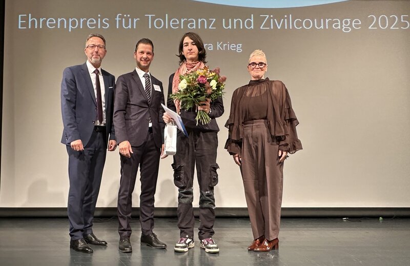 Den Ehrenpreis für Toleranz und Zivilcourage erhielten in diesem Jahr zwei Preisträger. Akira Krieg wurde für die Initiative für ein weltoffenes und tolerantes Oberhavel mit der Banner-Aktion „Nie wieder
