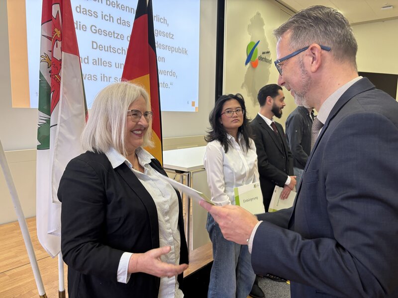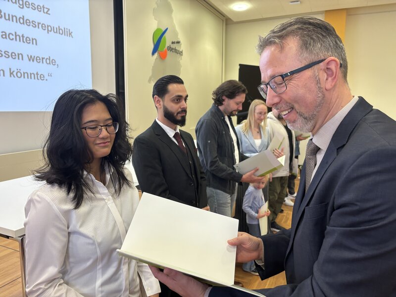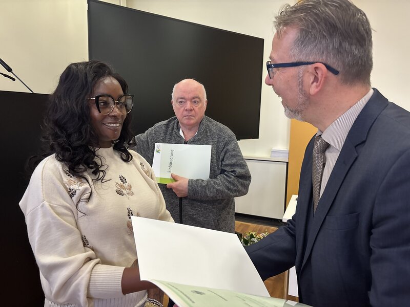 Insgesamt 61 Menschen aus 26 Herkunftsländern haben am Dienstag, 11.11.2025, von Landrat Alexander Tönnies im Kreistagssaal ihre Einbürgerungsurkunde bekommen. Sie stammen aus Kenia, Polen, Vietnam, Bosnien und Herzegowina, Rumänien, China, der Ukraine, dem Iran, Brasilien, Bulgarien, Kamerun, Serbien, Nordmazedonien, den USA, dem Libanon, Algerien, Thailand, dem Kosovo, der Türkei, Ungarn, den Niederlanden, Frankreich und Griechenland. Die meisten Neubürgerinnen und Neubürger kommen aus der Russischen Föderation (9), Syrien (9) und den Philippinen (6).