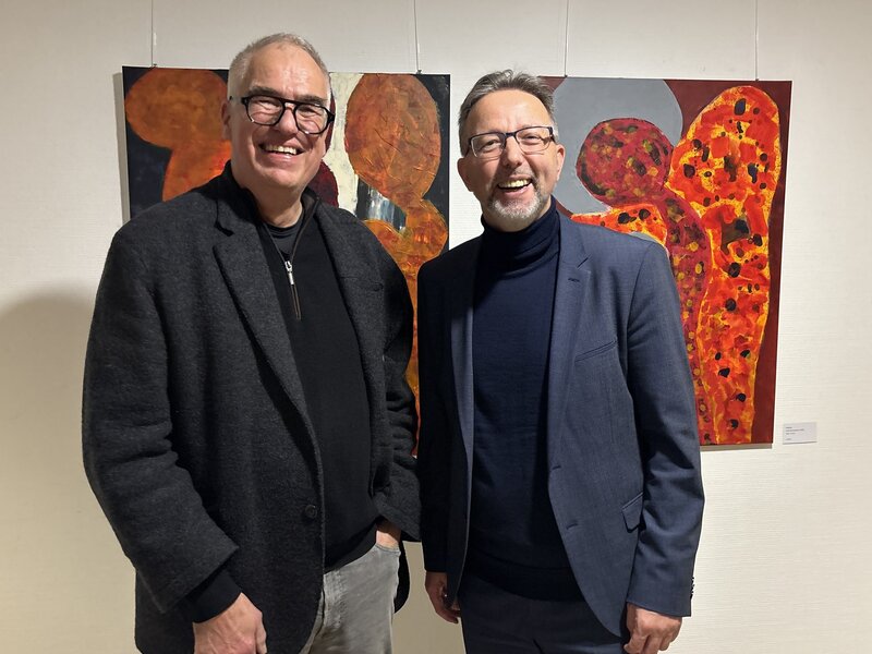 Arno Bunzel, Künstler aus Birkenwerder, zeigt in der Kreisverwaltung Oberhavel seine Ausstellung „Zauberwelten“. Landrat Alexander Tönnies eröffnete die Schau gemeinsam mit Arno Bunzel am Donnerstag, 08.01.2026. Den musikalischen Rahmen gestalteten Elsa Martin (Violine) und Charlotte Mehlberg (Violoncello) von der Kreismusikschule Oberhavel. „Ich freue mich, dass wir unsere Ausstellungsreihe in der Kreisverwaltung auch 2026 fortsetzen können. Sowohl ausgebildete Künstlerinnen und Künstler als auch Autodidakten zeigen hier ihre Arbeiten“, sagte Landrat Alexander Tönnies. „Arno Bunzel bringt nun im ganz wörtlichen Sinne Farbe in die Kreisverwaltung. Seine abstrakte Malerei lädt zu einer Entdeckungsreise ein, welche die Fantasie beflügelt.“