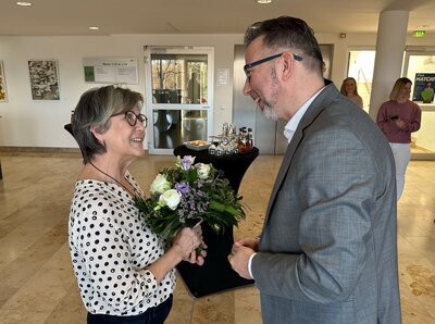 Sabine C. Tjaden, Künstlerin aus Hohen Neuendorf, zeigt in der Kreisverwaltung Oberhavel ihre Ausstellung „gestalten – gestellt – Gestalt“. Landrat Alexander Tönnies eröffnete die Schau gemeinsam mit der Malerin am Donnerstag, 05.03.2026. Den musikalischen Rahmen gestalteten Padmé Vonrath sowie Antonia und Verena Schluß von der Musikschule Klang-Farbe-Orange.