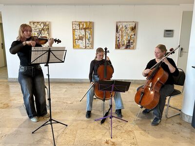Sabine C. Tjaden, Künstlerin aus Hohen Neuendorf, zeigt in der Kreisverwaltung Oberhavel ihre Ausstellung „gestalten – gestellt – Gestalt“. Landrat Alexander Tönnies eröffnete die Schau gemeinsam mit der Malerin am Donnerstag, 05.03.2026. Den musikalischen Rahmen gestalteten Padmé Vonrath sowie Antonia und Verena Schluß von der Musikschule Klang-Farbe-Orange.