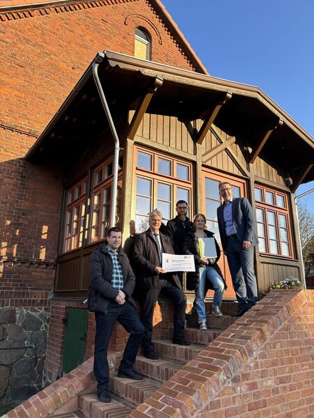 Ein roter Backsteinbau mit Segmentbogenfenstern und aufwändigen Ziegelornamenten prägt den Ortskern von Grieben. Das ehemalige Bauernhaus aus der Mitte des 19. Jahrhunderts ist ein wichtiges Zeugnis für den Aufschwung im Dorf, der 1868 mit dem Ausbau der Chaussee von Löwenberg nach Herzberg und dem Anschluss an die Bahnstrecken von Löwenberg nach Lindow und 1903 nach Neuruppin einsetzte. Dieses baugeschichtliche Zeugnis sanieren Marie und Ole Gaedemann. Unterstützt werden sie wie insgesamt 14 Projekte in Oberhavel mit Mitteln aus der Denkmalförderung des Landkreises. Symbolisch für alle geförderten Restaurierungen übergaben Landrat Alexander Tönnies und Baudezernent Egmont Hamelow jetzt den Fördermittelbescheid in Grieben. „Privatpersonen wie Familie Gaedemann, Kirchengemeinden und auch Kommunen setzen sich für den Erhalt der Baugeschichte unserer Region ein. Sie investieren viel Kraft und Geld, um Häuser wie dieses zu erhalten“, sagte Alexander Tönnies. „Dieses Engagement unterstützt der Landkreis jedes Jahr mit rund 300.000 Euro.“